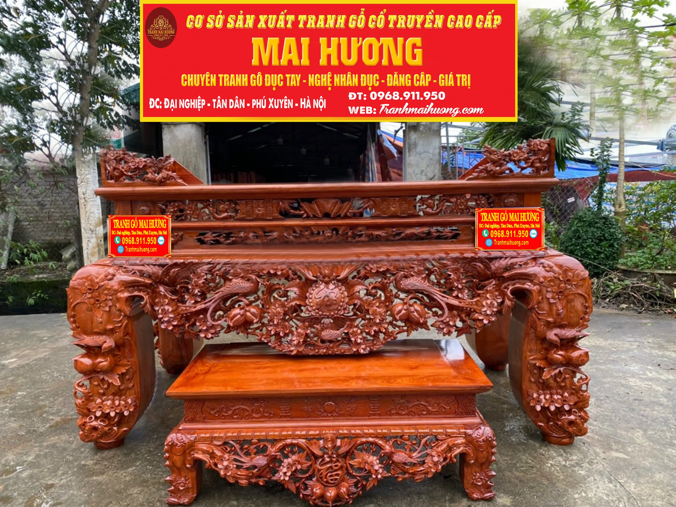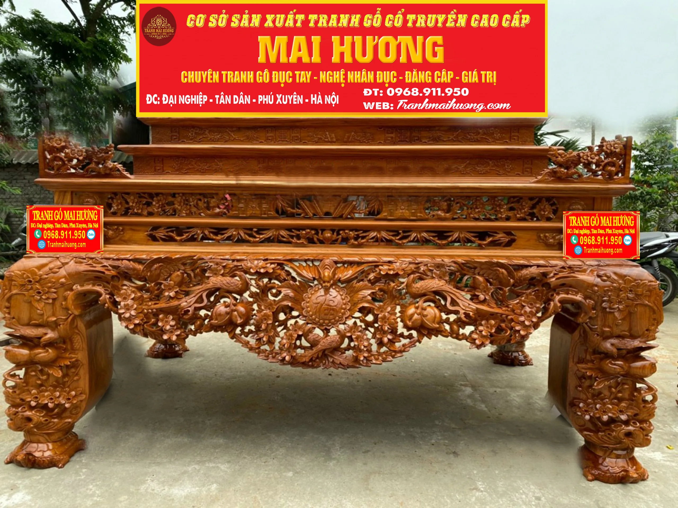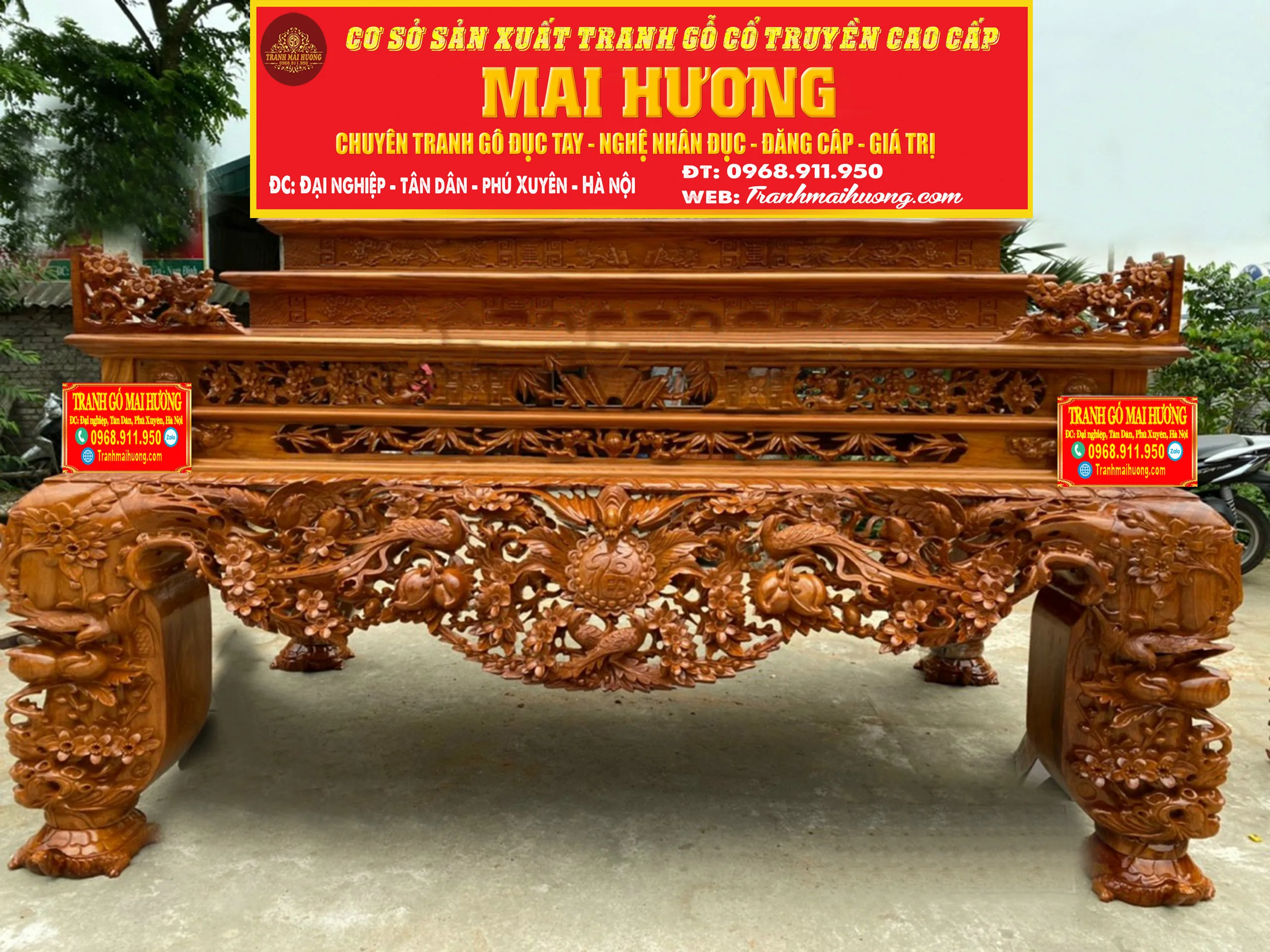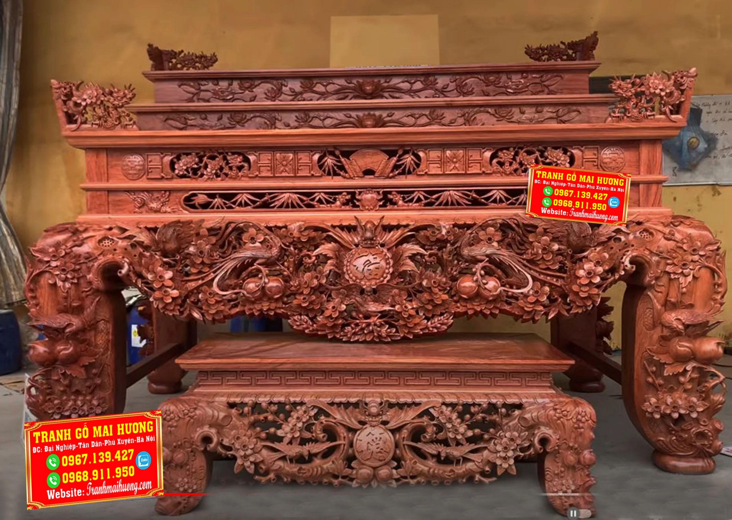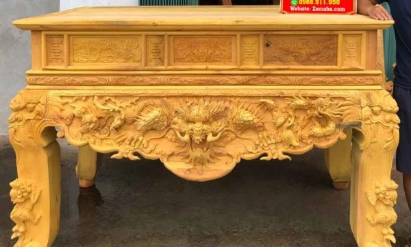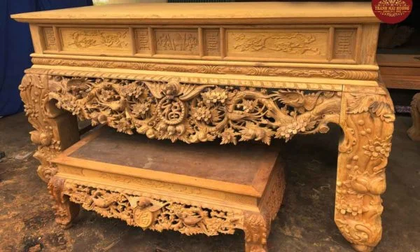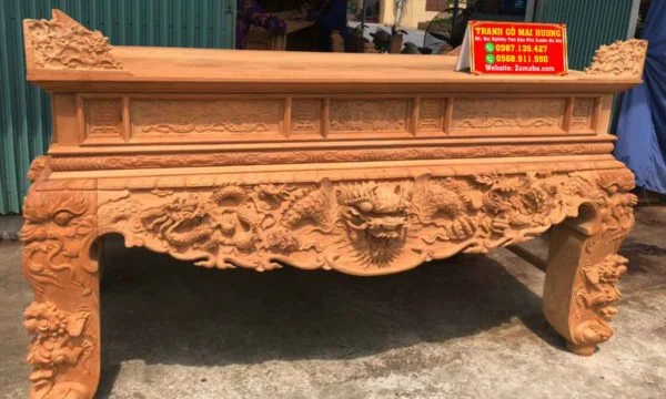 Sập thờ là một trong những mẫu bàn thờ gia tiên đang được rất nhiều gia đình lựa chọn. Loại bàn thờ này khá phù hợp cho không gian thờ cúng với diện tích rộng hoặc sử dụng trong không gian nhà thờ họ. Bởi sự uy nguy và tôn nghiêm của nó mang đến làm tâm điểm, điểm nhấn sâu sắc cho cả ngôi nhà. Một sập thờ giá rẻ thôi cũng đã được làm từ chất liệu gỗ tự nhiên quý hiếm đặt trong không gian thờ toát lên sự tôn nghiêm và linh thiêng. Đây là loại có chiều cao thấp, bốn chân trụ thường to tạo cảm giác vững chãi. Thường thường sẽ được chạm khắc những linh vật xung quanh bốn chân biểu thị cho quyền uy, dũng mãnh và mang ý nghĩa tâm linh rất lớn. Những loại gỗ quý ví dụ như gỗ Mít, gỗ Gụ, gỗ Hương, gỗ Sồi… tùy vào yêu cầu của khách hàng. Nhưng trong các loại gỗ kể trên thì tiêu biểu nhất vẫn là gỗ Mít và gỗ Gụ. tranh gỗ cổ truyền mai hương Theo tín ngưỡng xưa, Hoa Mai là hình ảnh mang đến những điều tốt lành, là sứ giả của mùa xuân, mùa đẹp nhất của một năm trăm hoa đua nở. Hai hình ảnh là nét đẹp truyền thống, là phong tục từ ngàn đời nay truyền lại. Cho nên, sập thờ được chạm khắc những hình ảnh này tạo nên cảm giác thiêng liêng, là vật kết nối tâm linh với con người nơi trần tục. Với sự kết hợp hoàn này giữa các chi tiết mai, điểu cùng với chữ phúc sẽ mang đến cho gia đình bạn những điều tốt lành, sự hạnh phúc, may mắn và trường thọ. Tứ linh có nghĩa là 4 loại vật gồm “Long – Ly – Quy – Phụng”. Bốn loài vật có sức mạnh phi thường và tượng trưng cho bốn yếu chính trong trời đất chính là đất, nước, lửa và gió. Hình ảnh tứ linh được sử dụng phổ biến trong những không gian cổ kính, thờ phụng linh thiêng hay tại nhà thờ họ, nhà thờ gia tiên…Tứ linh biểu hiện cho sự giàu có và quyền lực, đại diện cho hoàng tộc ngày xưa. Sập thờ tứ linh là mẫu sập thờ cao cấp được khắc lên 4 loài vật cao quý này với ý nghĩa của sự may mắn, đại diện về mặt tinh thần của con người trong cuộc sống. Sập Ngũ Phúc Với hình tượng chủ đạo Ngũ Phúc Thọ Dơi – Ngũ Phúc Kim Tiền . Mang ý nghĩa Trường Thọ Phú Quý Và May Mắn cho gia chủ sở hữu. Ngoài Ra các đường nét đục của chạm Sập Ngũ Phúc còn có hình ảnh quả trám . Tượng Trưng cho khí chất của người quân tử . Hơn Nữa ở 2 bên cạnh của chữ Phúc các nghệ nhân đã rất khéo léo. Lồng ghép hình tượng mai điểu mang ý nghĩa sum vầy hạnh phúc sự hoà hợp vợ chồng.Chất liệu dùng để làm sập thờ gỗ đẹp